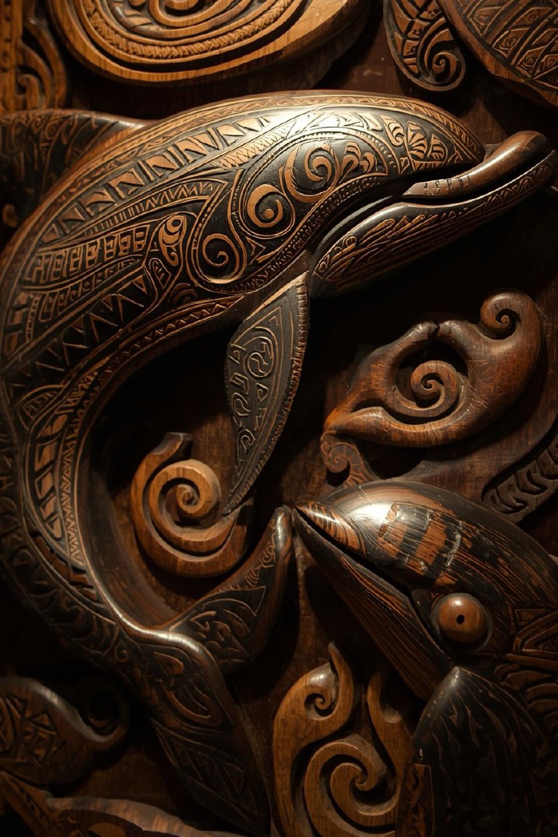 🗣 #Prompt : A detailed photograph of intricate traditional Maori wood carvings depicting a magnificent whale, showcasing the craftsmanship of indigenous artisans. The carved whale features intricate spiral bark patterns and traditional motifs engraved into rich dark totara wood, with fine details highlighting the animal's flowing lines and cultural significance. The carving displays traditional Māori artistic elements, including patterns inspired by tā moko, paua shell inlays for the eyes, and geometric patterns that flow smoothly across the whale's body. Warm diffused lighting illuminates the carved surface. #gemini #midjourney #grok #leonardoai #DALLE3 #stablediffusion #aiart #aiartist #neuralnetworks #deeplearning #aicommunity #aifantasyart #aifantasy #artificialintelligence #discord #beyondart #midjourneyai #graphicdesign Leonardo.ai