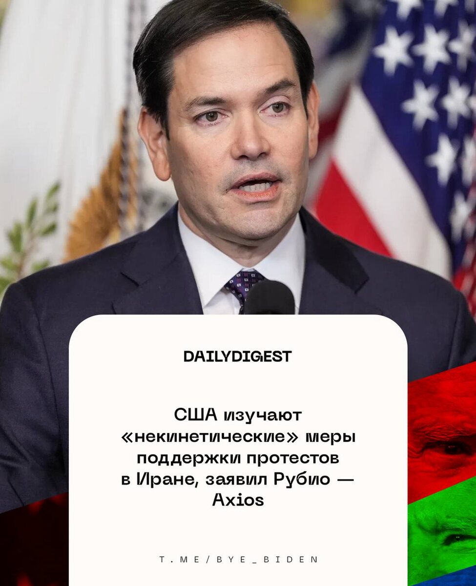 : 🔹США изучают «некинетические» меры поддержки протестов в Иране, заявил Рубио — Axios. 🔹Трамп призвал граждан США и их союзников покинуть Иран. 🔹НАБУ заявило, что разоблачило главу парламентской фракции Украины в подкупе законодателей. 🔹Стоимость биткоина поднялась выше $95 тыс. впервые с 17 ноября 2025 года, следует из данных площадки Binance. 🔹Корпорация Apple в начале 2026 года зарегистрировала в России одноименный товарный знак. 👍«БайБайден» в МАХ
