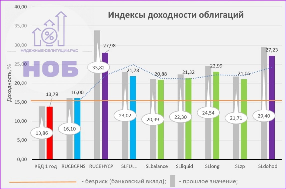 ✅ Максимальная процентная ставка по вкладам, публикуемая Банком России, 15,28% на третью декаду декабря декабря, снижение чуть меньше полпроцента; ✅ Индекс ОФЗ (КБД публикуется на сайте Мосбиржи) с дюрацией 1 год (КБД 1 год на графике👆) - без изменений; ✅ Индекс корпоративных облигаций RUCBCPNS (публикуется на сайте Мосбиржи) - без изменений; ✅ Индекс высокодоходных облигаций RUCBHYCP (публикуется на сайте Мосбиржи) - снижение почти на 6%; 📌 Индекс полной доходности Списка Лучших облигаций 2025 SLFULL снизился на чуть более 1%. В Список вошло 61 облигаций вместо 44 ранее, при этом общий порог входа по YTM был снижен в среднем на 5%, а CY на 3%! ✅ Индекс SLbalance портфеля СБАЛАНСИРОВАННЫЙ - без изменений; ✅ Доходность ликвидной части Списка SLliquid - снизился на процент; ✅ Индекс портфеля ДОЛГОСРОЧНЫЙ SLlong - снизился на 1,5%; ✅ Индекс облигаций с ежемесячным купоном SLzp - снижение около полпроцента; ✅ Портфель ДОХОДНЫЙ (индекс SLdohod) - снижение на 2%. Как формируются индексы (с