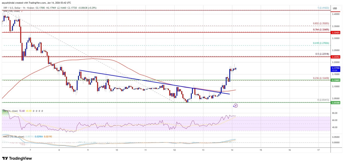 Цена XRP начала восстановительное движение выше $2.10, демонстрируя позитивные признаки, но может столкнуться с сопротивлением у отметки $2.220. Прорыв выше нисходящей трендовой линии на $2.080 указывает на потенциал роста. Восстановление произошло на фоне общего движения рынка, включая Bitcoin и Ethereum. 📊 Ключевые моменты: - XRP торгуется выше $2.120 и 100-часовой SMA. - Преодолено 23.6% уровень Фибоначчи коррекции ($2.416 до $2.034). - Основные сопротивления: $2.220 (50% Фибо), $2.250, $2.320, $2.350, $2.40, $2.420, $2.450. - Ключевые поддержки: $2.120, $2.10, $2.050, $2.020, $2.00. - RSI для XRP/USD выше 50, MACD теряет темп в медвежьей зоне.