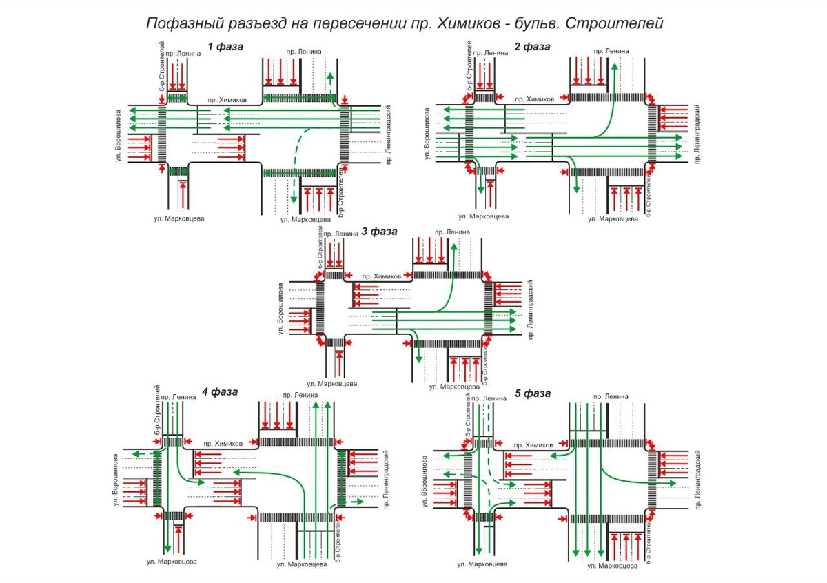 Химиков – б-р Строителей станет безопаснее Специалисты Центра организации дорожного движения разработали новую схему пофазного разъезда для повышения безопасности движения и улучшения пропускной способности. Движение с сегодняшнего дня будет выполняться следующим образом: 🚦1 фаза - движение транспорта по пр. Химиков от пр. Ленинградского и пешеходов через б-р Строителей 🚦2 фаза - движение транспорта по пр. Химиков к узкой части бульвара от широкой части и по пр. Химиков от ул. Ворошилова 🚦3 фаза - движение транспорта по пр. Химиков от узкой части бульвара 🚦4 фаза - движение транспорта по узкой части бульвара от пр. Ленина и по широкой части бульвара от ул. Марковцева с дополнительной секцией налево, движение пешеходов через пр. Химиков (обе стороны) 🚦5 фаза - движение транспорта по узкой части бульвара (оба направления) и по широкой части бульвара от пр. Ленина. ❤️ Наш канал в Дзен
