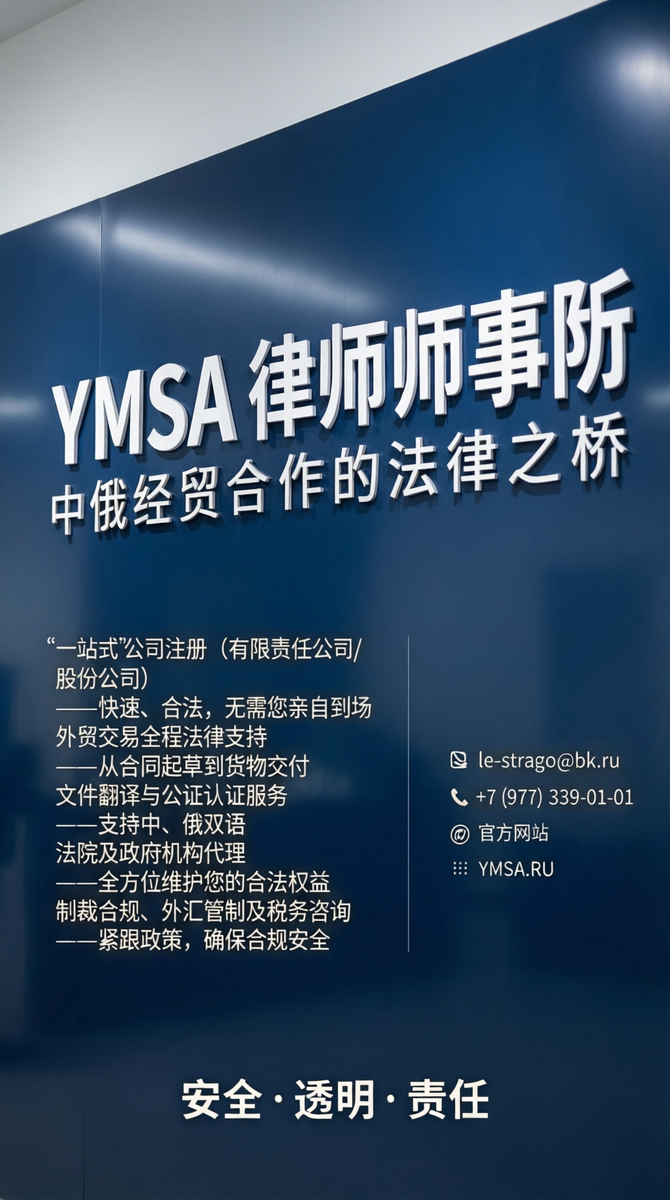 专为中国企业量身打造,助您在俄市场稳步发展、安全经营、赢得成功 您是否代表中国企业,并计划: YMSA 律师事务所 提供全流程法律支持,深谙俄罗斯法律法规,同时充分理解中俄商业合作的独特需求。 🔹 “一站式”公司注册(有限责任公司/股份公司) — 快速、合法,无需您亲自到场