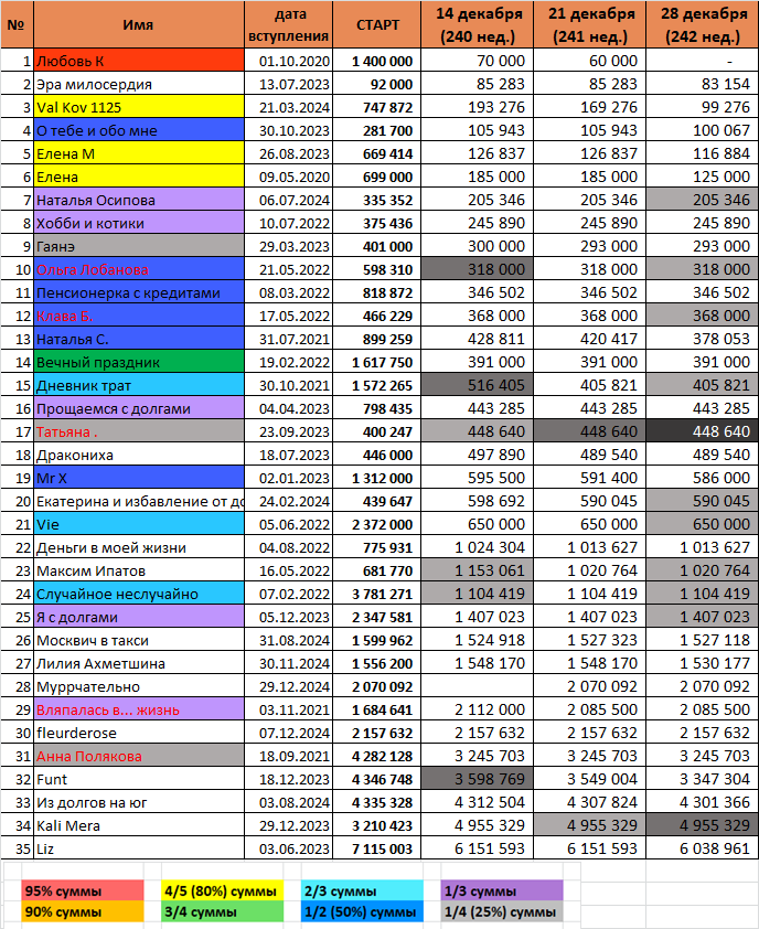 Все привет! Готова моя обещанная статья с итогами года. Давайте-ка вспомним, как выглядела наша табличка год назад, и как она выглядит теперь: За этот год марафон покинули 11 участников, из которых всего четверо - по причине погашения долга: это Vie (№21), Елена М. (№5), Елена (№6, и в этом же году она вновь к нам присоединилась) и... Хобби и котики (№8, она тоже снова с нами). Остальные покинули марафон либо по причине нескольких пропусков, либо по собственной инициативе, в частности, чтобы уступить место другим желающим (если вы помните, у нас была большая очередь из таковых, а некоторые участники практически топтались на одном месте, раз в месяц отмечая погашение по графику). На освободившееся в таблице место приходит новый участник. И в этом году их, соответственно, тоже было 11. Вот эти люди: Большие планы Фоксина жизнь Галина L. Елена Денежная Ладные финансы Татевик К Мадемуазель Полина Флёр де Лиз._В поисках Анна Чёрная икра А что если... Выбывшие и нови