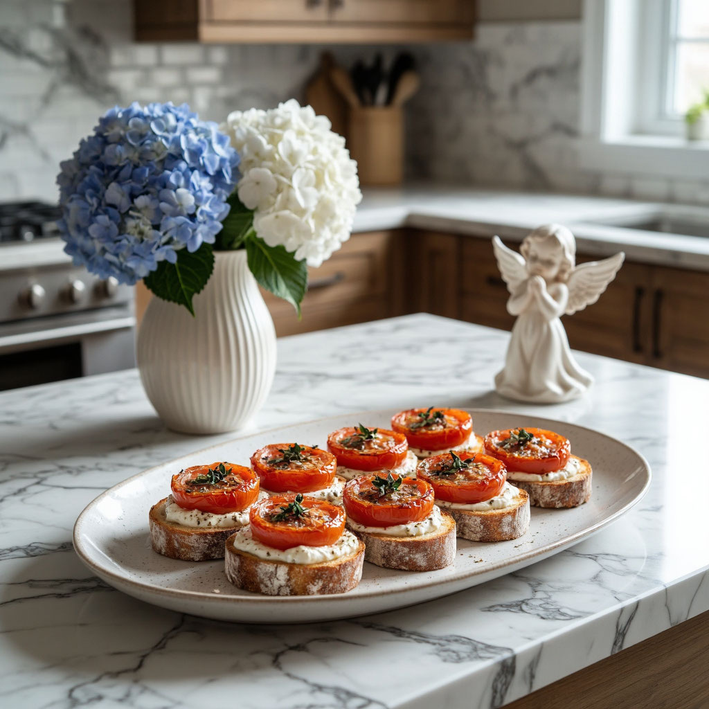 * Подавайте на деревянной доске или мраморной тарелке — так брускетта выглядит дороже, чем вы потратили на ингредиенты.