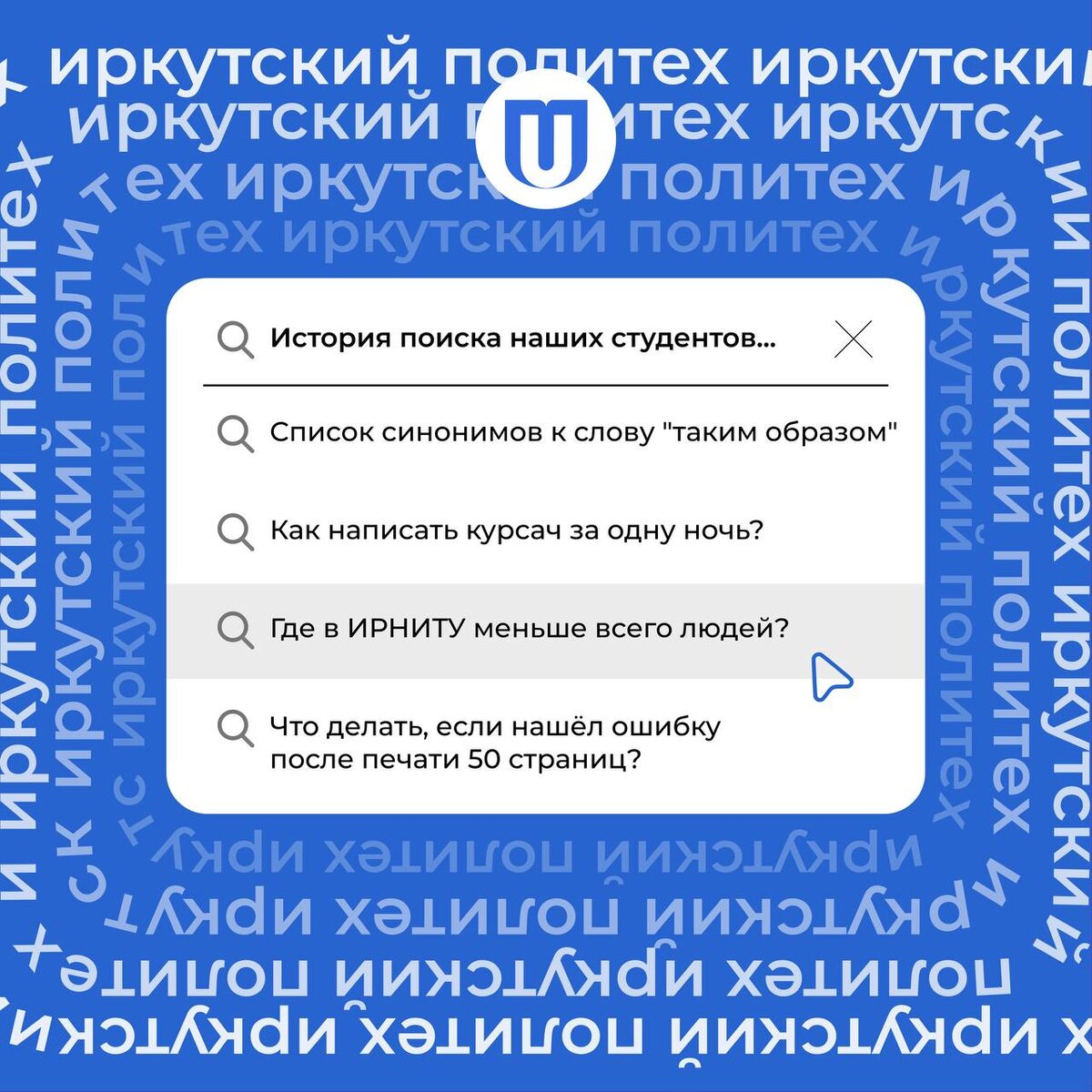 ! От «где найти методички по лабораторным» до «где в ИРНИТУ меньше всего людей?». А ещё — «расписание пар», «когда стипендия» и даже «как работает кофемашина в главном корпусе» ☕️ Но мы уверены: у каждого из вас есть свой неповторимый поисковый запрос! 👇 Делитесь в комментариях — что вы чаще всего гуглите как студент Иркутского политеха? Самые креативные, честные или жизненно важные запросы — опубликуем в следующем посте! 👻 МАХ | 💙 ВК | 📝 ДЗЕН