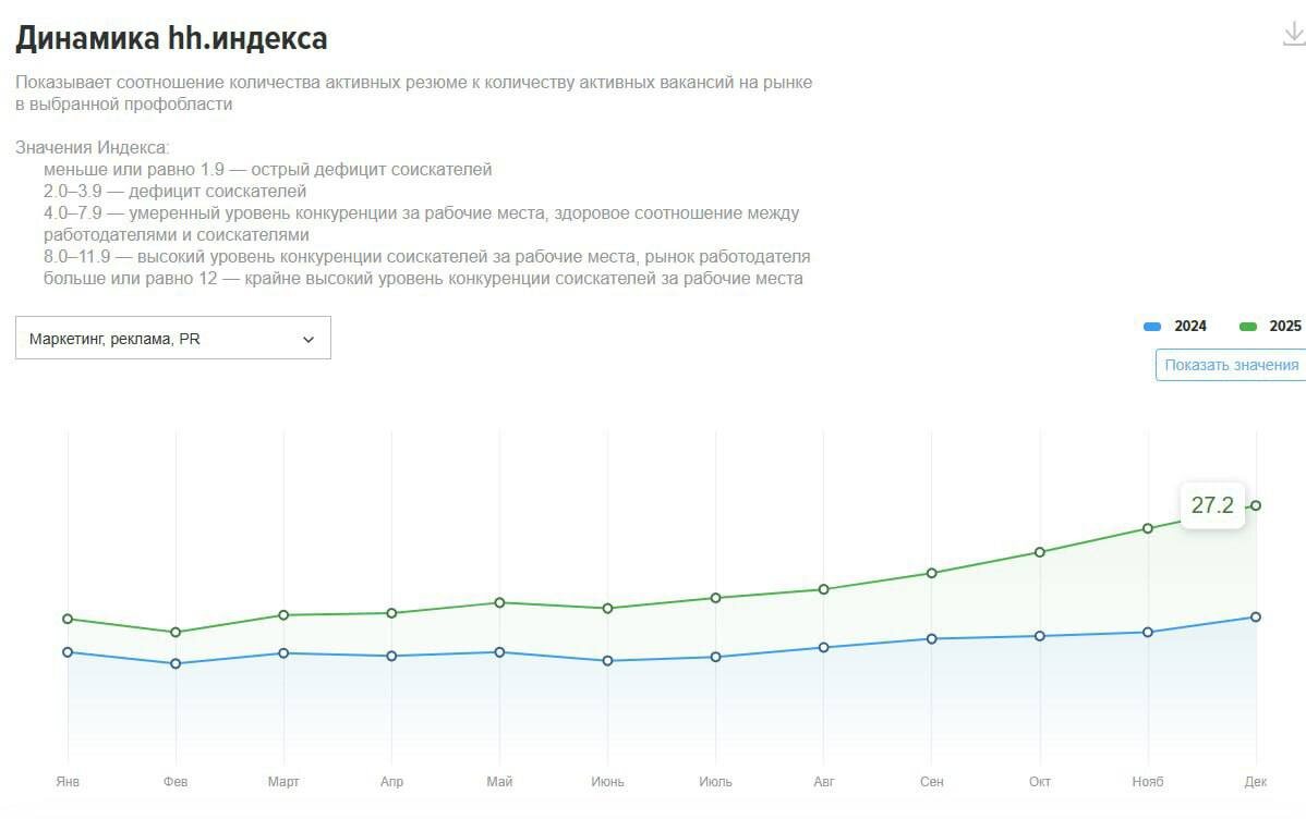 Количество резюме в маркетинге — на пике Поразмышлял, что ждет маркетинг и маркетологов в 2026-2027 году. Вышли данные за декабрь: количество безработных маркетологов и пиарщиков — на исторических максимумах. Похожим образом дела обстоят в менеджменте и IT. Рынку больно, но в целом ожидаемо. Считается, что маркетинг и PR — это прокси на экономику: плохо экономике — плохо маркетингу, экономика растёт — маркетинг оживает. Поэтому первый очевидный вывод — экономике плохо.
