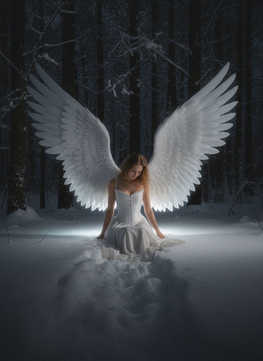 Внешний вид строго соответствует загруженному эталонному фото. Заснеженный лес ночью. Девушка сидит на снегу, опустив голову и глядя вниз. На ней белое платье-корсет. За ней очень большие, массивные белые ангельские крылья, мягко светящиеся снизу. Сильная вспышка на девушке, темный фон. Нет падающего снега. Высокое ISO, сильный цифровой шум, размытие движения, плохая фокусировка. Низкое качество, как у Sony A7R IV, без ретуши. Настоящее фото с телефона, ночная съемка, очень слабая вспышка, высокое ISO, цифровой шум, плохая фокусировка ➡️ Генерируем ТУТ 💵 Отблагодарить 💥boost