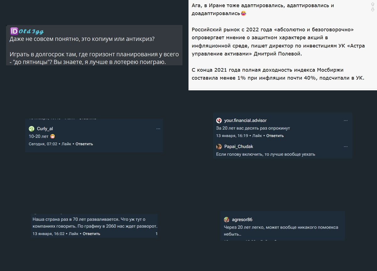 Почитал ваши комменты в духе «в России инвестировать нет смысла, всё равно кинут». Слушайте, а какие у вас варианты? Реально. Что делать с заработанным? Тратить всё под ноль? Гуляй, рванина? Окей. А дальше что? Что делать, если завтра останешься без работы или просто физически не сможешь пахать в том же темпе? Сказать себе «ну, не повезло»? Думаете, я сам не боюсь? Да я точно так же жду очередной налоговой реформы, которая может оставить меня без штанов. Но я готовлюсь. Как раз по списку «Уровня FU»: своё жилье, надежная машина, акции топовых эмитентов с дивидендами. Почему именно акции? Да потому что тот же Сбер или Сургут принадлежат бенефициарам этой страны. И они пойдут «на корм» последними — уж точно после малого бизнеса или депозитов физлиц. Жить в России, может, и сложнее, чем в Европе или Штатах. Спорить не буду. Но жить в такой непредсказуемой стране без надежной заначки и активов — это уже чистое самоубийство. Без вариантов. Чтобы не искать посты в ленте: подписывайтесь на