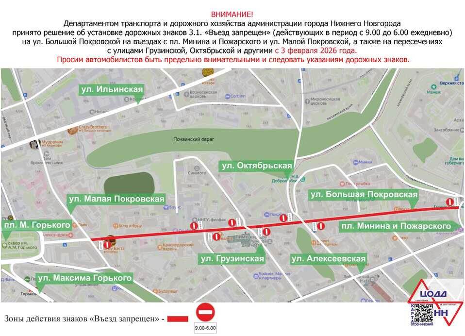 С 3 февраля 2026 г. на улице Большой Покровской в Нижнем Новгороде установят знаки «Въезд запрещен», запрещающие проезд транспорта с площади Минина, улиц Малой Покровской, Грузинской и Октябрьской. Как сообщили в городском департаменте транспорта и дорожного хозяйства, запрет будет распространяться на период с 9:00 до 6:00. Подъезд к торговым точкам для погрузки-разгрузки товаров будет разрешен ежедневно в период с 6:00 до 9:00. Ранее нижегородцы неоднократно поднимали вопрос необходимости введения ограничений и привлечения к ответственности водителей, въезжающих на пешеходную улицу. Для выявления нарушителей ПДД на улице Большой Покровской также планируется установить дополнительные камеры фиксации, работающие автоматическом режиме. Как ранее писал NN.DK.RU, в 2025 г. в Нижнем Новгороде рассматривали возможность установки заградительных боллардов на улице Большой Покровской — стационарных, выдвижных или полуавтоматических столбов для борьбы с несанкционированной ездой транспортных сре