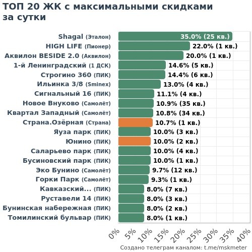 🟩 Честные скидки: 37 ЖК (331 кв.) 🟧 Маркетинг скидки: 18 ЖК (60 кв.) 💎 МАКСИМАЛЬНАЯ ЭКОНОМИЯ 🏆 Эталон • Shagal ├🔻32.5M → 93.0M • 4-к 185м² ├🔻20.0M → 57.2M • 4-к 121м² └🔻19.8M → 56.6M • 4-к 121м² 🥈 Пионер • HIGH LIFE └🔻19.4M → 88.2M • 4-к 121м² 🥉 Аквилон • Аквилон BESIDE 2.0 └🔻4.6M → 22.9M • 3-к 67м² 4️⃣ ПИК • Строгино 360 ├🔻3.1M → 21.2M • 2-к 51м² └🔻3.0M → 21.0M • 2-к 51м² 5️⃣ ПИК • Саларьево парк └🔻2.9M → 29.2M • 3-к 83м² 🔑 САМЫЕ ДОСТУПНЫЕ 🏆 Самолёт • Новое Внуково ├🔻521к → 7.4M • Студия 23м² ├🔻546к → 7.8M • Студия 23м² └🔻553к → 7.9M • Студия 25м² 🥈 Самолёт • Эко Бунино └🔻400к → 8.1M • Студия 24м²❗️ 🥉 ПИК • Ильинские луга ├🔻588к → 8.4M • 1-к 35м² └🔻589к → 9.1M • 1-к 36м² 4️⃣ Самолёт • Большое Путилково └🔻426к → 8.8M • 1-к 36м² 5️⃣ ПИК • Томилинский бульвар └🔻731к → 9.1M • 1-к 33м² ❗️— лоту меньше месяца 👇 Полная статистика: 📲 В Telegram | 🌐 На MskMeter.ru