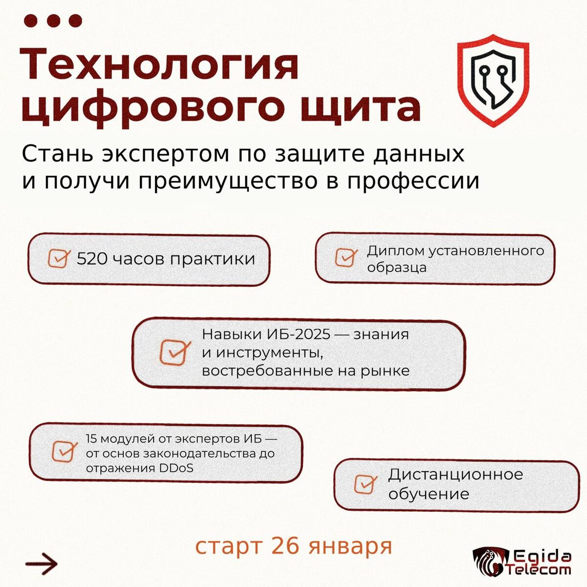 🛡 «Технология цифрового щита» стартует 26 января – онлайн-курс, который даёт не теорию «в вакууме», а рабочие навыки! В мире, где кибератаки происходят каждый день, важно не просто знать о рисках, а уметь защищать свои данные, систему и компанию. Курс разработан компанией «Эгида-Телеком» – практиками, которые ежедневно работают с ИБ-инцидентами, защитой инфраструктуры и реальными угрозами бизнеса и у них интересный тг канал 🙌🏼 Этот курс для тех, кто хочет: ✔ понимать ИБ как профессию ✔ разбираться в правовых и технических основах ✔ решать реальные задачи, а не учить «для галочки» ✔ получить подтверждённую квалификацию Что внутри: • 15 модулей с логичным переходом от теории к практике • 520 часов обучения в удобном темпе • дистанционная платформа • диплом о профессиональной переподготовке Вы разберёте: 📝как устроена защита систем и данных 📝реальные инциденты (в том числе атаки на крупные инфраструктуры) 📝как выявлять фишинг, вредоносное ПО и уязвимости 📝как не стать жертвой
