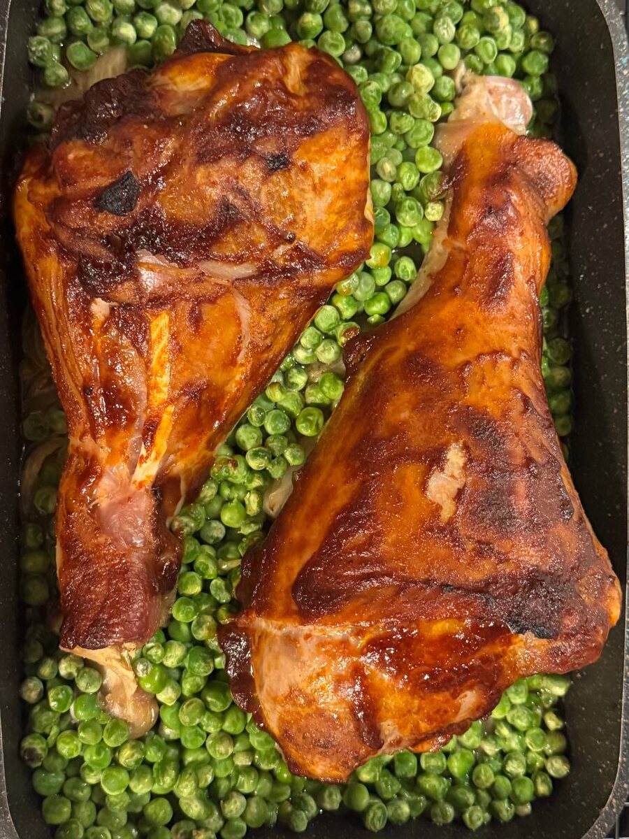 ! Блюдо выходного дня - Томлёная голень индейки Ингредиенты: 1️⃣ Голень индейки - 2 шт 2️⃣ Зелёный горошек мороженый - 0,5 кг 3️⃣ Растительное масло для обжарки - 2 - 3 ст.л 5️⃣ Соль, перец 6️⃣ Сахарная пудра - 2 ст.л 7️⃣ Соевый соус - 4 ст.л 8️⃣ Томатная паста - 1 ст.л Приготовление: 1. Раскалите масло на сковороде и обжарьте индейку до румяной корочки. 2. Уложите индейку на дно формы для запекания либо подобной посуды. Посолите сверху и снизу, посыпьте перчиком 3. Укройте сверху фольгой 4. Томите в духовке на 180 градусах, на равномерном прогреве 1 час 45 минут 5. Приготовьте смесь из томатной пасты, соевого соуса и сахарной пудры 6. По истечение времени, фольгу снимите, но не выбрасывайте, обмажьте индейку, сверху, томатно-соевой смесью, добавьте размороженный горошек и запекайте ещё 15 минут на 200 градусах для образования хрустящей корочки 7. Выньте индейку и накройте фольгой на 20 минут Получается нежное, сочное мясо! Ангела за трапезой! Ваш ПП - Православное Питание