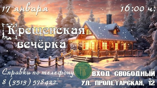 1 7 января Крещенская вечёрка!!!!! Приходите ВСЕЙ СЕМЬЁЙ играть в традиционные игры, танцевать бытовые танцы и кадрили, петь песни, веселиться, знакомиться и общаться с друзьями. Приветствуются вкусняшки к чаю! Вход свободный, с собой иметь вторую обувь. ___ Когда: 17 января 16.00 Где: Пролетарская 12 ГДК. ( старая часть города) Доп. телефон 89080581501 Николай ----- Сообщает: Миасская Вечёра 🫛Миасс Православный