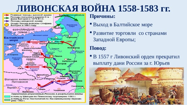 В середине XVI века Московское государство стремилось укрепить свои позиции в Прибалтике. Ключевые мотивы: Иван IV Грозный рассматривал Ливонию как удобный плацдарм для экспансии. В 1557 году он отверг предложение Ливонского ордена о перемирии, а в январе 1558 года начал вторжение. Январь 1558 года: русские войска (около 40 000 человек) под командованием хана Шиг‑Алея, воевод М. В. Глинского и Д. Р. Захарьина‑Юрьева вторглись в Ливонию. Ключевые победы: К 1561 году Москва контролировала две трети территории Ливонского ордена. Ливонская конфедерация фактически распалась. Однако уже на этом этапе проявились первые проблемы: Успехи Москвы встревожили соседей. В 1561 году Польша по просьбе части ливонских рыцарей ввела войска и захватила Ригу, Ревель, Дерпт. Швеция также вступила в конфликт, овладев Ревелем и прибрежными крепостями. Ход боевых действий: К 1577 году Москва потеряла большую часть завоеваний. Война превратилась в изнурительное противостояние с коалицией Польши и Швеции. После