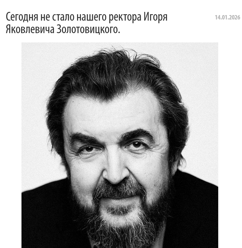 Жалею не потому знала лично, хотя актеров мы считаем чуть ли не соседями. которые в любое время, как ни включишь телевизор, входят в наш дом. Просто очень мало осталось среди них тех, о ком мы не узнаем в ежедневном режиме - женился, развелся, отдохнул на Мальдивах с новой пассией, продал, купил квартиру, поскандалил в баре, одет в шмотки от такой-то фирмы, равняйтесь на него... Почти не осталось тех, о ком можно вспомнить исключительно добрым словом, вспомнив роли в театре и кино, перечислив еще и учеников, которым профессионалы и педагоги с большой буквы дали путевку в жизнь. Игорь Золотовицкий был ректором Школы-студии МХАТ. Школа-студия МХАТ скорбит и выражает соболезнования семье ректора — жене Вере Харыбиной, сыновьям Алексею и Александру, а также всем его родным и близким, всем, кто любил. Видела Игоря Золотовицкого в нескольких программах ТВ, где он всегда с добрым юмором, с неугасаемой улыбкой рассказывал о своих коллегах. Даже попытки сплетню пустить, уколоть, принизить не бы