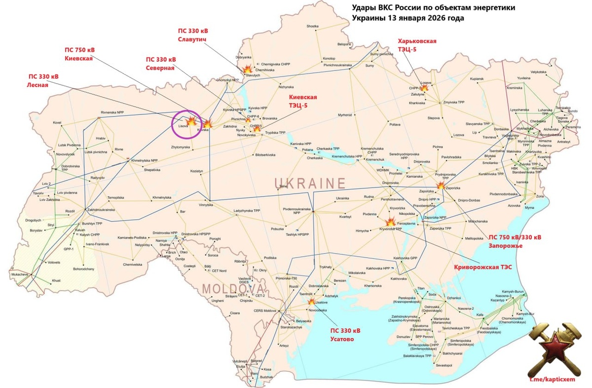 За сутки до этого, наши БпЛА наведались до ПС 330 кВ Лесная (фиолетовый овал). Видно, как отсекается Киев и область по ВЛ.