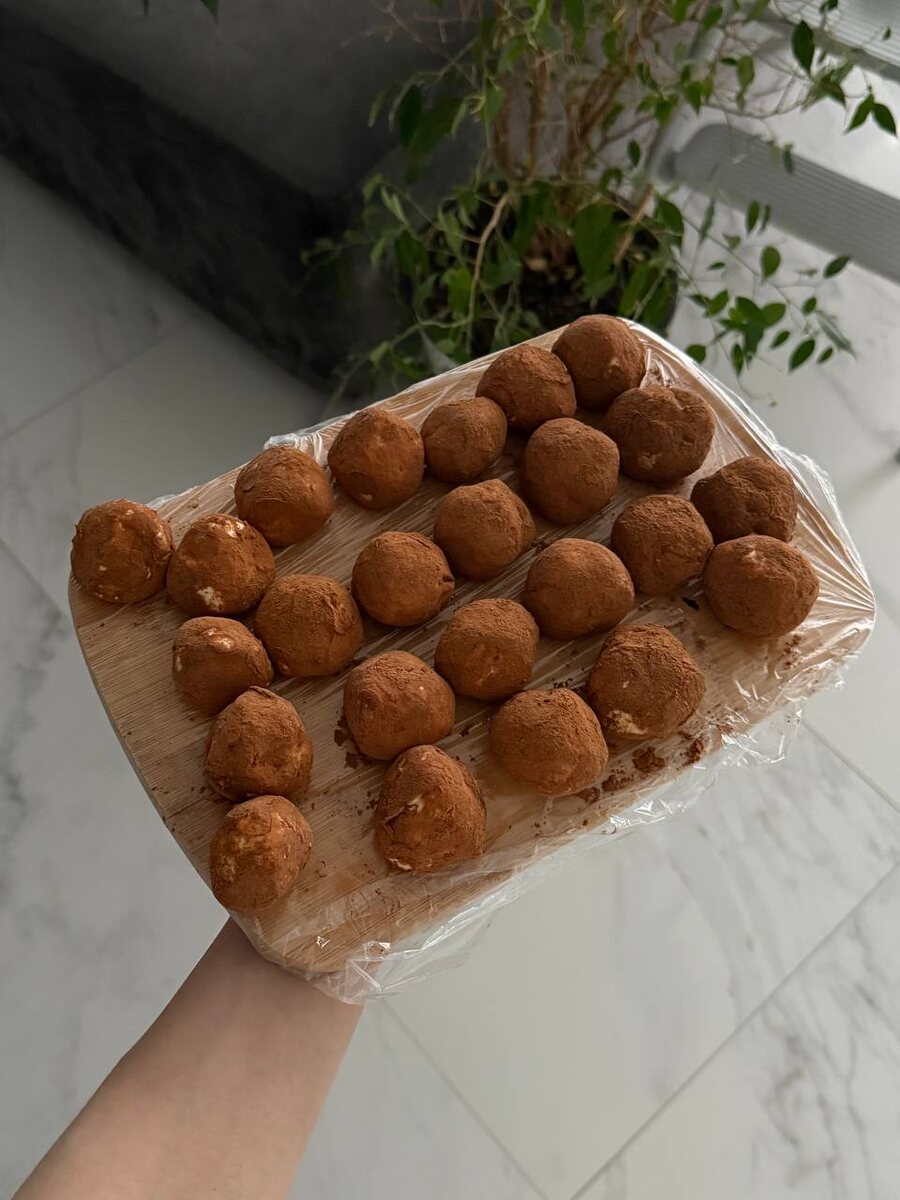 »🍬 Всего три ингредиента: • детская смесь малютка единичка • мороженое пломбир • масло сливочное • какао порошок • орехи (в начинку по желанию) 1. Смешать 300г смеси малютки + 200г пломбира + 180г подтаявшего масла. Чтобы не было комочков можно смешать миксером 2. Ставим в холодильник примерно на час для застывания 3. Ложечкой зачерпать сливочную массу и сформировать шарики, положить вовнутрь орешек ( по желанию) и обвалять в какао порошке 4. Уложить конфетки на доску и заморозить, после сложить в контейнер или пакетик. Хранить в морозилке Очень вкусно когда конфетка полежит и чуть растопится, тогда она не такая твердая и холодная Из такого количества выходит ~ 2 таких подносика #рецепты