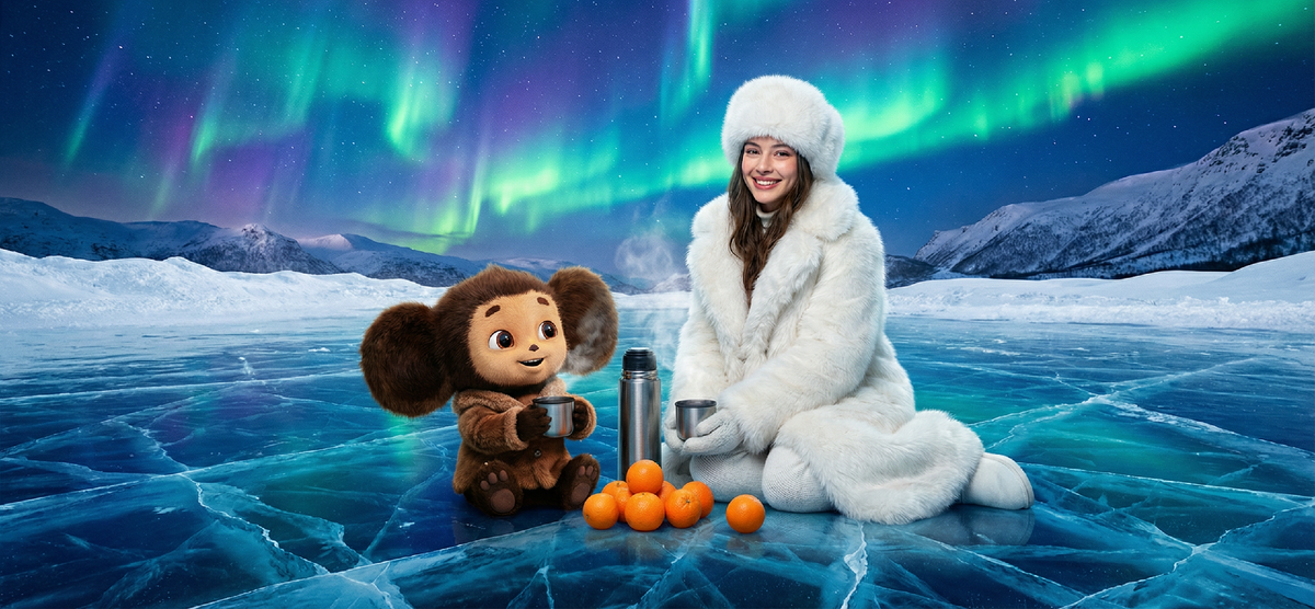 Вы и Чебурашка на замёрзшем озере, в пушистых шубах, с термосом чая и апельсинами. Фон — лазурный лёд и северное сияние.