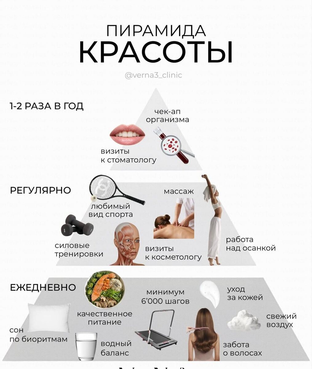 Красота редко держится на разрозненных действиях. Кремы, процедуры, советы подруг — всё это работает иначе, когда между шагами есть порядок. Представь пирамиду. Внизу — повседневные привычки. Сон, питание, вода, движение. Без этого верх шаткий, как ни старайся. Чуть выше — регулярные действия. Домашний уход, поддержка тела, работа с лицом. Они дают качество, когда база живая. На вершине — контроль. Осмотры, анализы, коррекция курса. Он спасает от метаний и спонтанных решений. Это история не про идеал. И не про крайние меры. Это про ясность и спокойствие, когда ты понимаешь, что делаешь и зачем. Когда пирамида собрана, отражение радует без качелей и разочарований. Сохрани схему. Отправь тем, кто устал метаться между баночками и ожиданиями.