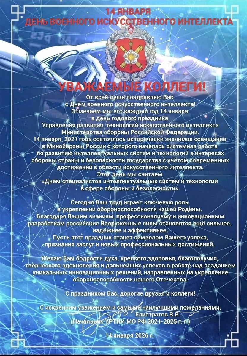 ! От всей души поздравляю Вас с Днём военного искусственного интеллекта! Отмечаем мы его каждый год 14 января в день годового праздника Управления развития технологий искусственного интеллекта Министерства обороны Российской Федерации. 14 января 2021 года состоялось исторически значимое совещание в Минобороны России с которого началась системная работа по развитию интеллектуальных систем и технологий в интересах обороны страны и безопасности государства с учётом современных достижений в области искусственного интеллекта. Этот день мы считаем «Днём специалистов интеллектуальных систем и технологий в сфере обороны и безопасности». Сегодня Ваш труд играет ключевую роль в укреплении обороноспособности нашей Родины. Благодаря Вашим знаниям, профессионализму и инновационным разработкам российские Вооружённые силы становятся ещё сильнее, надёжнее и эффективнее. Пусть этот праздник станет символом Вашего успеха, признания заслуг и новых профессиональных достижений. Желаю Вам бо