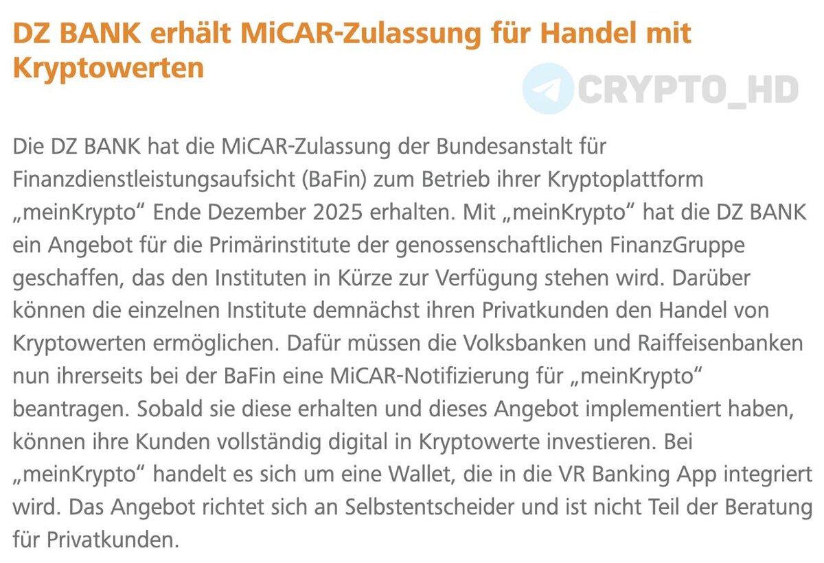 Π DZ Bank ΠΏΠΎΠ»ΡΡΠΈΠ»ΠΈ ΡΠ°Π·ΡΠ΅ΡΠ΅Π½ΠΈΠ΅ ΠΎΡ Π½Π΅ΠΌΠ΅ΡΠΊΠΎΠ³ΠΎ ΡΠΈΠ½Π°Π½ΡΠΎΠ²ΠΎΠ³ΠΎ ΡΠ΅Π³ΡΠ»ΡΡΠΎΡΠ° Π½Π° Π·Π°ΠΏΡΡΠΊ ΠΊΡΠΈΠΏΡΠΎΠΏΠ»Π°ΡΡΠΎΡΠΌΡ Β«meinKryptoΒ». ΠΠ΅ΡΠ°Π»ΠΈ: β’ ΠΠ»ΠΈΠ΅Π½ΡΡ ΡΠΌΠΎΠ³ΡΡ ΡΠΎΡΠ³ΠΎΠ²Π°ΡΡ ΠΊΡΠΈΠΏΡΠΎΠ°ΠΊΡΠΈΠ²Π°ΠΌΠΈ Π½Π°ΠΏΡΡΠΌΡΡ ΡΠ΅ΡΠ΅Π· Π±Π°Π½ΠΊΠΎΠ²ΡΠΊΡΡ ΠΈΠ½ΡΡΠ°ΡΡΡΡΠΊΡΡΡΡ. β’ Π‘Π΅ΡΠ²ΠΈΡ Π±ΡΠ΄Π΅Ρ Π΄ΠΎΡΡΡΠΏΠ΅Π½ ΠΊΠ»ΠΈΠ΅Π½ΡΠ°ΠΌ Volksbank ΠΈ Raiffeisenbank. β’ ΠΠ½Π²Π΅ΡΡΠΈΡΠΈΠΈ ΠΏΠΎΠ»Π½ΠΎΡΡΡΡ ΠΎΠ½Π»Π°ΠΉΠ½, Π±Π΅Π· ΡΡΠ°ΡΡΠΈΡ ΠΊΠΎΠ½ΡΡΠ»ΡΡΠ°Π½ΡΠΎΠ² ΠΈ ΠΌΠ΅Π½Π΅Π΄ΠΆΠ΅ΡΠΎΠ². DZ Bank ΡΠ²Π»ΡΠ΅ΡΡΡ Π²ΡΠΎΡΡΠΌ ΠΏΠΎ Π²Π΅Π»ΠΈΡΠΈΠ½Π΅ Π±Π°Π½ΠΊΠΎΠΌ ΠΠ΅ΡΠΌΠ°Π½ΠΈΠΈ. Crypto Headlines