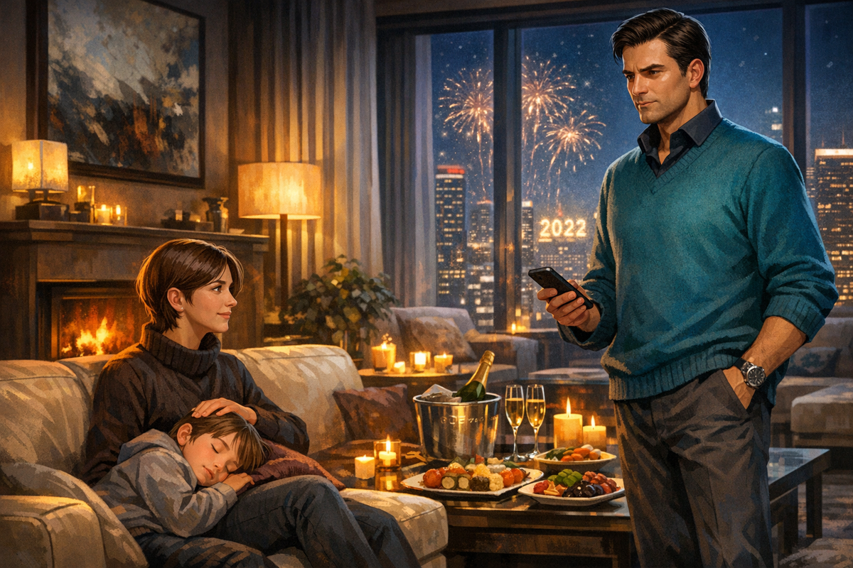 Вскоре возвращается Воронцов. Он успел быстро переодеться. Теперь его тёмные волосы высушены и безупречно уложены, лицо свежее, собранное. На нем мягкие велюровые брюки темно-серого цвета и удобные полуспортивные туфли из тончайшей кожи. Сверху – простая, но безукоризненно скроенная рубашка-поло и лёгкий кашемировый пуловер цвета морской волны. Несмотря на роскошь номера, здесь, на верхнем этаже, чувствовалась лёгкая прохлада, и его одежда говорила о стремлении к комфорту, а не к показной роскоши.