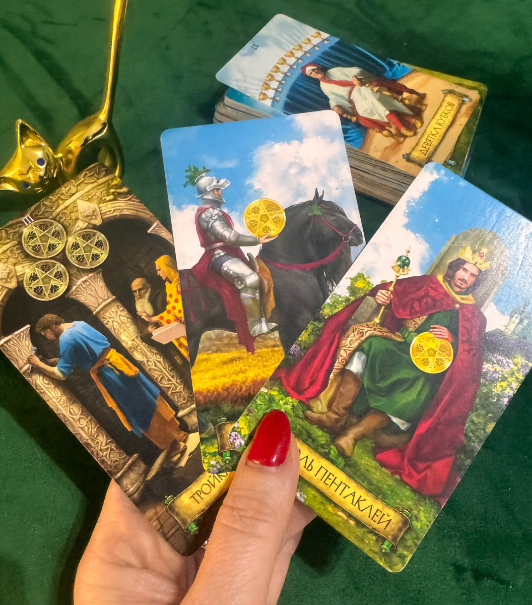 Комбинация Рыцаря и Короля Пентаклей также может указывать на появление мужчины, возможно, того, с кем у вас была пауза в общении. Этот человек проявит инициативу, приедет или сделает серьёзное деловое (или личное) предложение, связанное с финансами или долгосрочными планами.