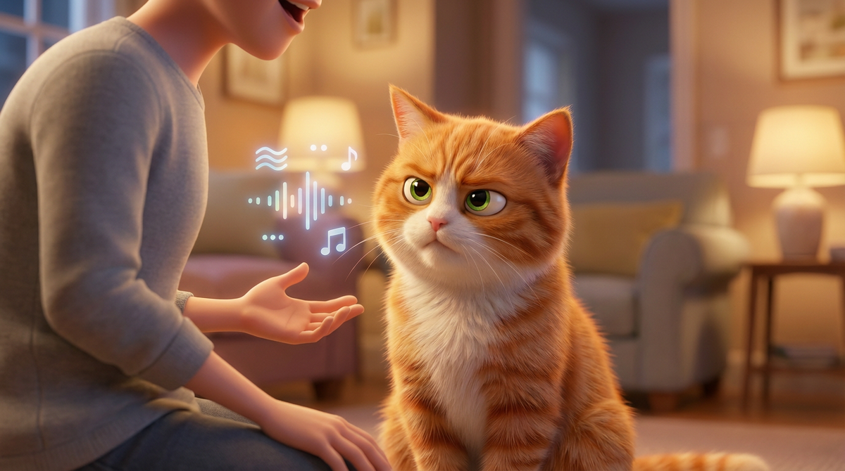 Когда вы говорите: "Котик, я сейчас схожу в магазин, куплю тебе вкусную рыбку, приду через час, ты тут веди себя хорошо, не балуй" - кот слышит примерно: "Котик... эмоция спокойная... слово 'рыбка' - хорошо! ... остальное - фоновый шум".