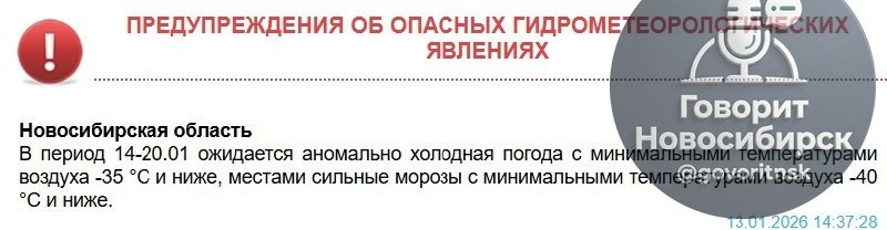 Специалисты «Западно-Сибирского УГМС» выпустили экстренное предупреждение, в нём говорится, что сильные морозы в регионе ожидаются с 14 по 20 января включительно. Аналогичная ситуация ожидается и в соседних регионах, практически на всей территории Сибири. Сил и терпения нам всем 🥶 Говорит Новосибирск