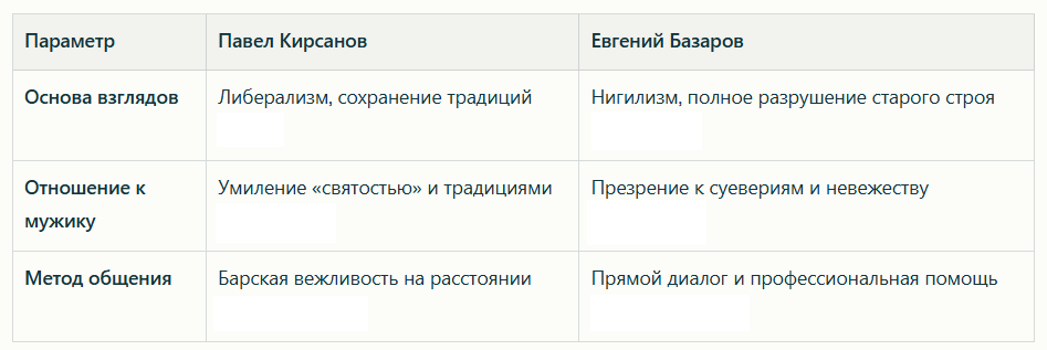 С исторической точки зрения более прогрессивными считаются взгляды Базарова. Он отрицает устаревшие сословные предрассудки и верит в силу естественных наук, медицины и труда, а не в абстрактные либеральные ценности. Однако Тургенев показывает трагизм Базарова: его прогрессивность разбивается о непонимание самого народа, ради которого он хочет «расчистить место». Кирсановы же остаются представителями уходящей эпохи, чьи идеи реформ свер