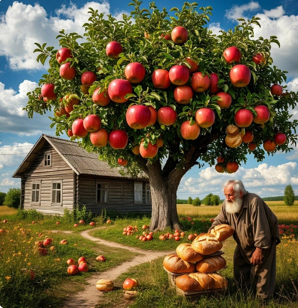 Он осторожно снял одно яблоко. Укусил. Сок потёк по подбородку — сладкий, прохладный, как детство. Потом взял буханку — тёплую, мягкую, пахнущую берёзовыми дровами и материнской заботой.