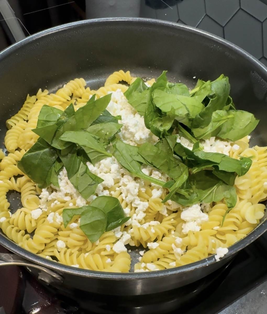 - Добавьте горячие макароны и шпинат, аккуратно перемешайте.