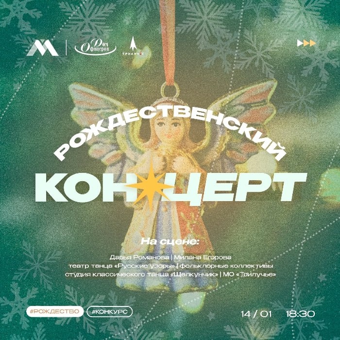 Праздничное мероприятие с участием творческих коллективов и молодых исполнителей состоится в Доме офицеров сегодня. Об этом сообщили в Псковском городском молодёжном центре. Зрителей ждут выступления солисток Дарьи Романовой и Миланы Егоровой, номера от студии классического танца «Щелкунчик» и театра танца «Русские узоры», а также выступления фольклорных ансамблей и молодёжного объединения «Трилучье». Кроме того, в этот вечер пройдет смотр новогодних костюмов участников конкурса «Рождественский карнавал». Ведущие вечера – Кирилл и Софья Радион. Концертная программа начнётся в 18.30