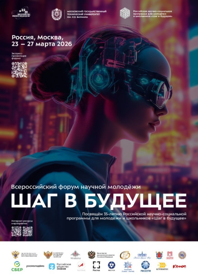 » С 23 по 27 марта 2026 года столица станет центром притяжения для лучших молодых исследователей и разработчиков страны. Что ждет участников: 🔹 Работа в первоклассной академической среде: на базе 13 мировых научных центров и 11 ведущих вузов России. 🔹 52 тематические секции: от инженерных и точных наук до социально-гуманитарных направлений. 🔹 Насыщенная программа: научно-технологическая выставка, фестиваль дизайнеров, олимпиады и экскурсии в секретные лаборатории. 🔹 Главное событие — битва команд за Научно-технологический кубок России! 🏆 🔗 Узнать подробности и посмотреть презентацию: шагвбудущее.рф/fabout 🌐 Официальные сайты: step-into-the-future.ru, шагвбудущее.рф 📞 Телефоны для справок: (499) 267-55-52, (499) 263-62-82.