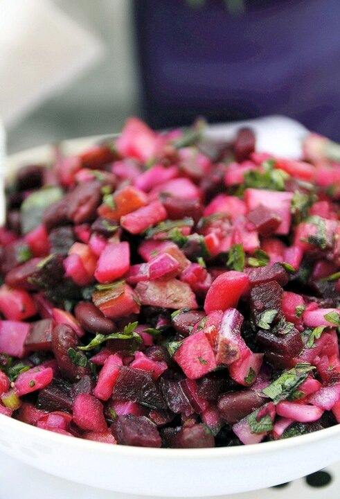 Я называю его обычно ложным - дома. Но в слово может восприниматься с неправильным оттенком. Мол, экономный вариант: не хватило чего-то, чем богаты - тем и рады. А это не так: это просто сочетание ингредиентов удачное. И когда винегрет приелся, наскучил - можно с чистой совестью приготовить этот салат. Он такой же сочный, свекольно-похрустывающий, такой же ароматно-витаминный. Но - и другой. И заправка в нем другая немного - что вносит новые нотки в характер салата и вкус. Ложный винегрет - или ленивый: рецепт + ингредиенты. И про отличия 1) Свекла. Свеклу отварить, охладить, измельсить так, как для винегрета. А я настоятельно советую запечь - даже прошу :) Это две разные свеклы, два разных вкуса. Запеченная свекла ароматнее, слаще. Она удивительно душистая, ее вкус - концентрированный. И она не бывает “переваренной”. Картофель. Отваренный в мундире и хорошо охлажденный картофель нарезать кубиками. Огурец. Маринованный (или лучше соленый) огурчик встряхнуть от маринада или рассола - и