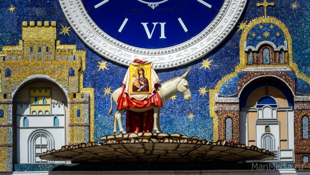 В самом сердце Йошкар-Олы, на фасаде Национальной художественной галереи, время обретает не просто голос, а целое визуальное евангельское повествование. Уникальные часы с движущимися фигурами — это не просто архитектурное украшение, а глубокая «динамичная икона», оживающая каждый час под мелодичный бой курантов. В новогодние праздники, когда город сияет гирляндами, это зрелище приобретает особую, сказочную торжественность. Центральный образ этого механического представления — Богородица с младенцем Иисусом на руках, восседающая на ослике. За Ней следуют три фигуры волхвов. Этот сюжет иллюстрирует одно из ключевых событий Нового Завета — «Бегство Святого Семейства в Египет». Каждый час под музыку эта скульптурная группа совершает свой недолгий путь, превращая фасад здания в страницу ожившего Писания. Это редкий пример того, как сложный часовой механизм служит не только утилитарной цели, но и становится проводником культурного и духовного кода. В дни новогодних каникул площадь перед гале