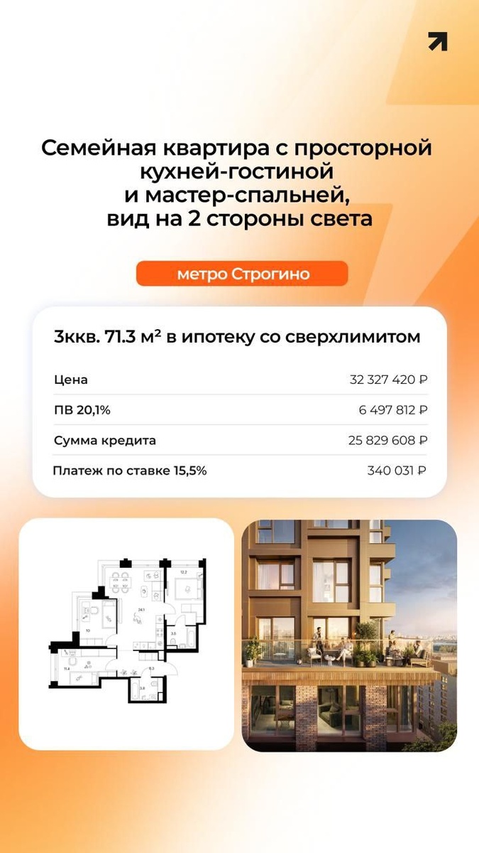 ▶️ Семейная ипотека 6% – Для семей, у которых есть ребенок до 6 лет включительно. – Ставка значительно ниже рыночной, что уменьшает ежемесячный платёж и делает покупку комфортнее для бюджета семьи с ребёнком. Условия: – ПВ от 20% – Ставка 6% – До 30 лет; до 12 млн. ₽ Пример расчета - 2ккв. 56.8 м² с чистовой отделкой ▶️ Семейная ипотека свыше 12 млн ₽ – Ипотека для семей, у которых есть ребенок до 6 лет включительно. – Программа позволяет взять кредит на большую сумму, чем по обычной семейной ипотеке. Условия: – ПВ от 20,1% – Ставка от 6,06% до 17,10% – До 30 лет; от 12,15 до 30 млн ₽ Пример расчета - 3ккв. 71.3 м² с видом на 2 стороны света ▶️ Комбинированная семейная ипотека - Для семей, у которых есть ребенок до 6 лет включительно. - Комбинирование двух видов банковских ставок предоставляет преимущества, превышающие условия стандартных коммерческих программ, а также расширяет выбор - можно остановиться на более просторной квартире с увеличенной площадью. Условия: – ПВ от 20,