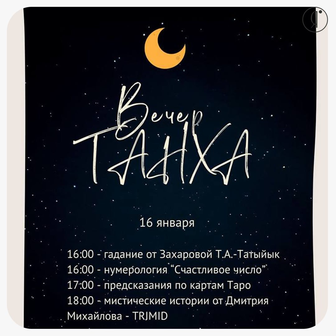 + #Вечером #Квизы Программа вечера: 16:00 – Искусство гадания от Татьяны Захаровой-Татыйык; 16:00 – Нумерологический практикум «Ваше счастливое число»; 17:00 – Предсказания по картам Таро; 18:00 – Захватывающие мистические истории от Дмитрия Михайлова -TRIMID. 16 января | 19:00 Библиотека «Маяк», Маяковского, 81 +7 (914) 101-97-36 Online Якутия | Ждем вас в МАХ