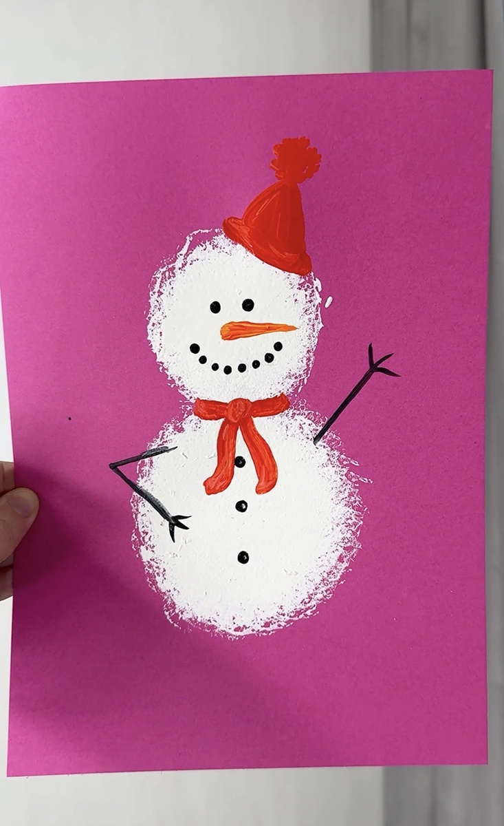 И делаем отпечатки на цветном картоне в форме снеговика