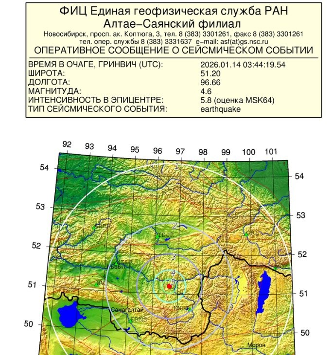 Землетрясение в 5,8 баллов произошло в Сибири Подземный толчок зафиксирован утром 14 января в Туве. По данным Алтае-Саянского филиала Геофизической службы РАН, его магнитуда составила 4,6, а интенсивность 5,8. По данным МЧС, эпицентр находился в 52 км от села Сизим. Ведомство указывает, что звонков от населения не поступало, объекты жизнеобеспечения функционируют в штатном режиме. Подписаться| Прислать новость| Помочь бустами