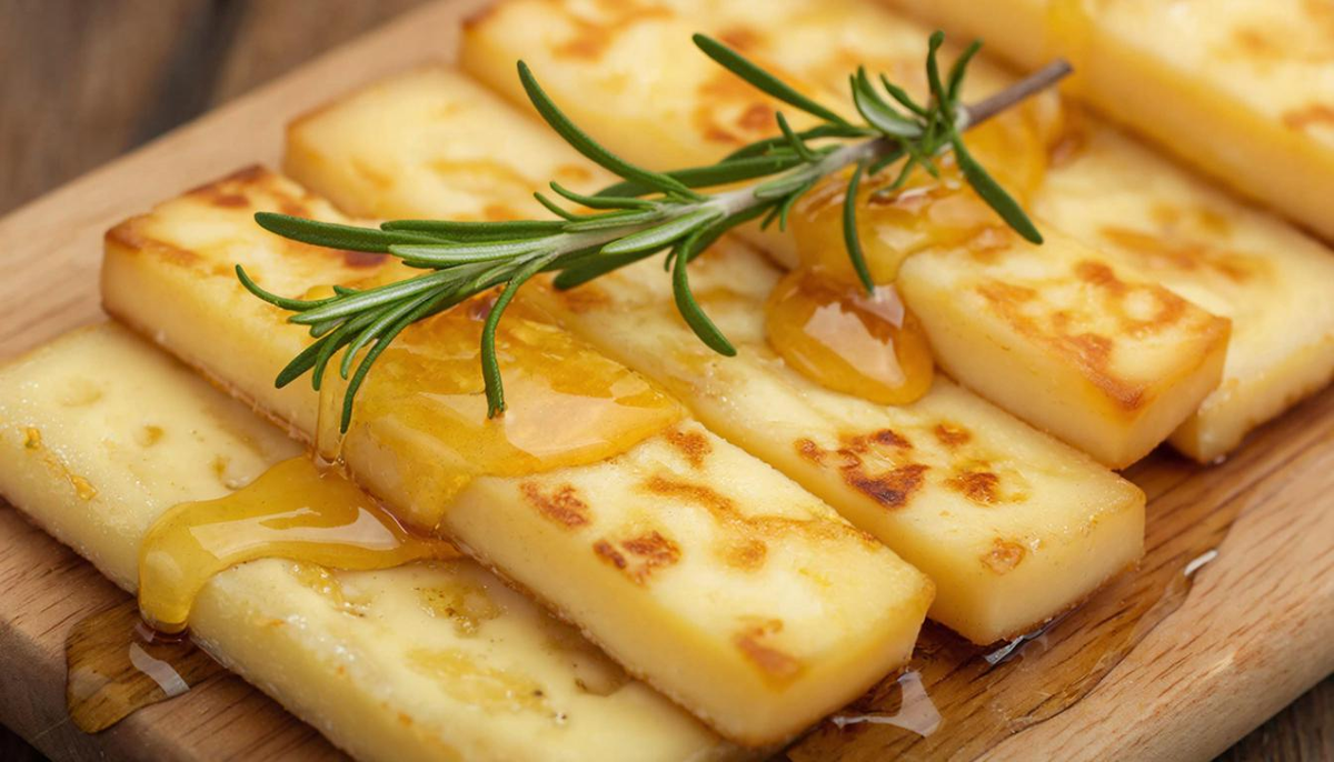 - Ключевой способ: Нарежь сыр брусочками. Разогрей на сковороде немного сливочного масла, брось веточку свежего или щепотку сушеного розмарина. Обжарь сырные палочки 30-60 секунд до легкой корочки. Выложи на доску, полей жидким медом и посыпь дроблеными орехами (из пакетика).