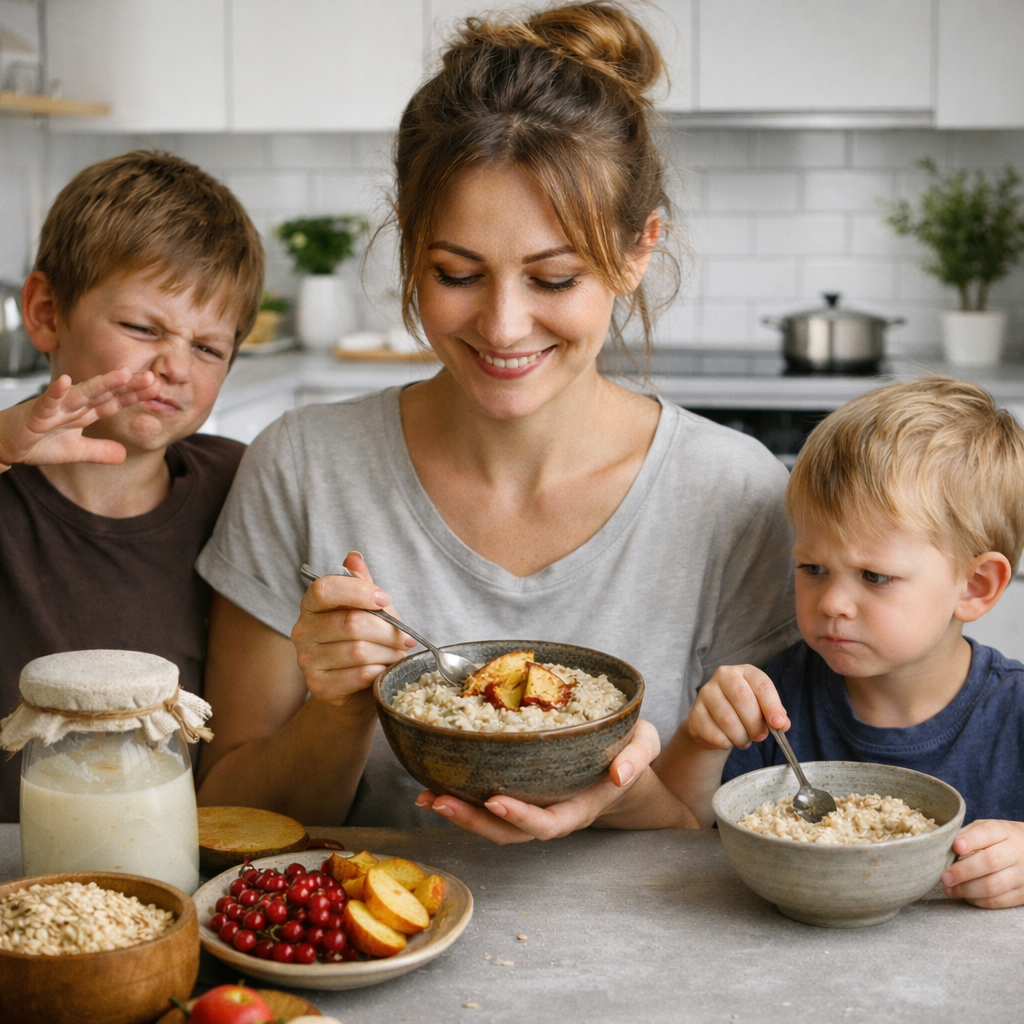 Я думала, что знаю про каши всё. Ну правда. Трое детей, пятилетний стаж материнства, бесконечные эксперименты с меню. Но однажды утром, когда я решила «быть хорошей мамой» и приготовить Максу и Мише суперполезную кашу из овсянки, всё пошло не по плану. Макс не хотел есть, потому что «она пахнет как мокрые носки». Миша тыкал ложкой и с подозрением спрашивал: «А это точно еда?» А я стояла и думала — ну почему? Я же старалась! Всё замочила, сварила, подала с ягодками. Но каша была... странная. Тяжелая, клейкая, с привкусом недоверия к жизни. И вот вечером, после традиционного материнского марафона (зубы у Даши, игрушки по всей квартире, и попытки поработать между подгузниками), я нашла одну статью. И вот там, друзья мои, всё стало на свои места. Оказывается, овсянку просто так есть нельзя. Точнее — можно, но не нужно. Потому что есть там такие штуки — антинутриенты, которые мешают нашему организму переваривать и усваивать всё полезное. И если не замочить овсянку правильно, не добавить кис