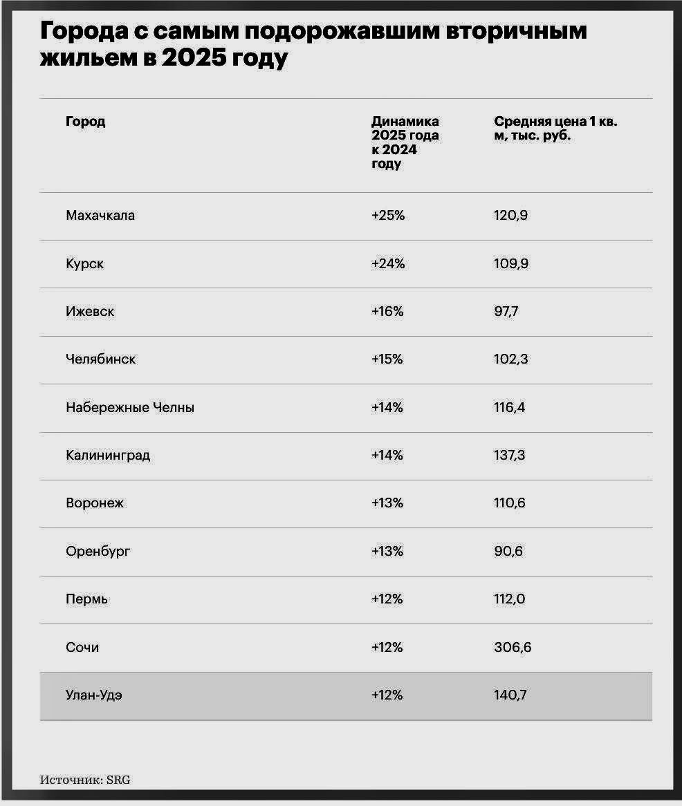 Вторичка дорожает вопреки прогнозам многих экспертов. РБК привел статистику роста цен на вторичке за 2025 год Среди 50 крупнейших городов страны в минус ушел только Новокузнецк, там цена просела на 2% за год В остальных городах стоимость выросла Для чего это инвесторам⁉️ Инвестор должен понимать разные локации, следить за динамикой цены и вовремя принимать решение об инвестировании. Нужно успевать в начальный период роста цены, именно так инвестор заработает максимум💰 💥Неожиданный лидер рейтинга Махачкала с ростом в 25% за год. Махачкала последние пару лет активно развивается, туда тянутся люди как на ПМЖ, так и на отдых🏆 Простая математика🔢 Стоил объект год назад 4 млн Сейчас стоит 5 млн Кто-то заработал миллион, и это не вы☹️ 🥈Курск +24% Рост цен здесь начался еще осенью 2024 года. Из приграничья народ потянулся в столицу региона 🥉Ижевск +16% 🏅Челябинск +15% 🎖️Набережные Челны +14% Согласитесь, что лидеры вовсе не очевидны. Дело в том, что в большинстве городов, где