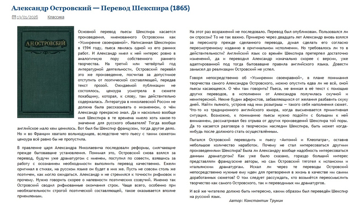 Александр Островский — Перевод Шекспира - Критика