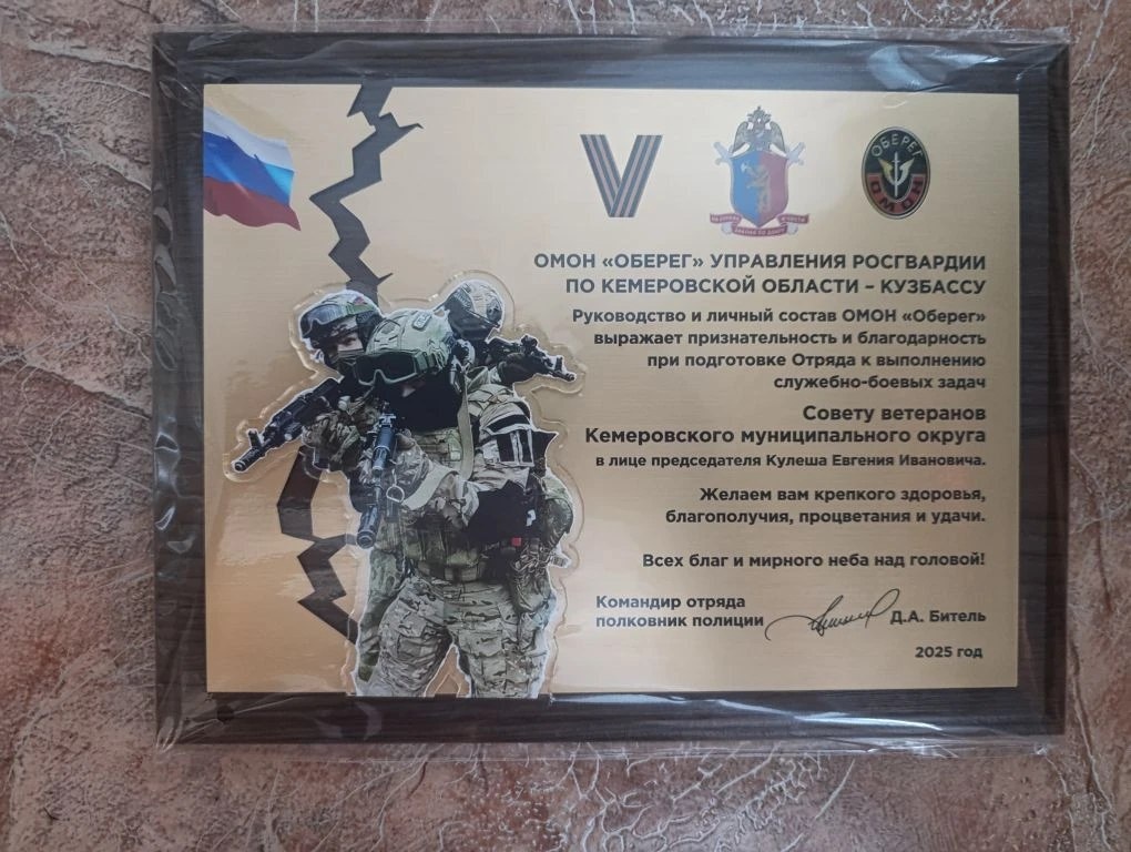 Руководство и личный состав отряда ОМОНа «Оберег» высказали благодарность Совету ветеранов Кемеровского округа и председателю Евгению Кулешу