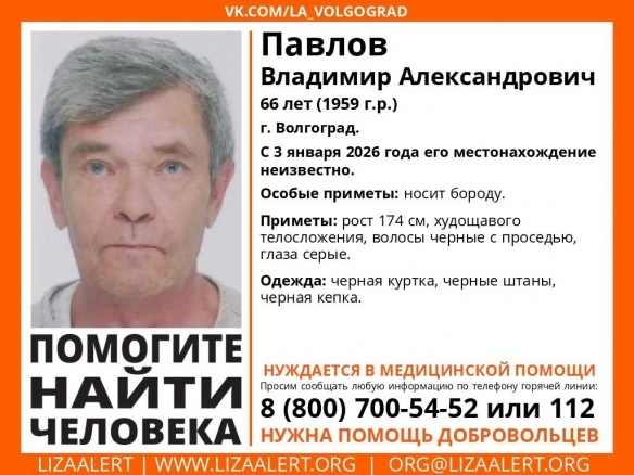 Местонахождение мужчины остается неизвестным уже более десяти дней. Поисково-спасательный отряд «ЛизаАлерт» в Волгоградской области организовал поиски 66-летнего Владимира Павлова, который пропал в Волгограде 3 января 2026 года.Приметы разыскиваемого: рост 174 сантиметра, худощавое телосложение, черные с проседью волосы, серые глаза и характерная борода. В день исчезновения Владимир был одет в черную куртку, черные штаны и черную кепку. Волонтеры и правоохранительные органы проверяют все возможные версии. Всех, кто может располагать информацией о местонахождении Владимира Павлова, просят сообщить по круглосуточным телефонам горячей линии: 8-800-700-54-52 или 112. Поисковые мероприятия продолжаются. Илья Николаев. Фото: поисково-спасательный отряд«ЛизаАлерт».