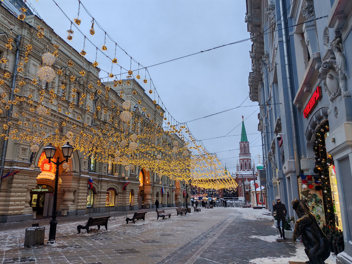 В ГУМ тоже до 10 часов не пускали, так что мы просто прошлись до конца Никольской, посмотрели новогоднее оформление.