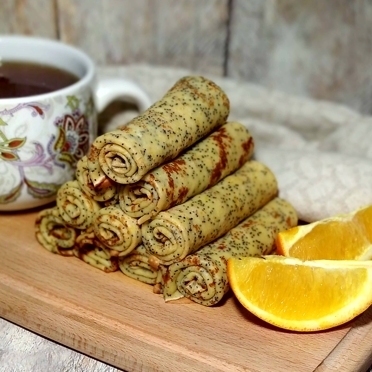 Чтобы блины были тонкими, нужно готовить жидкое тесто - муки брать немного, при этом увеличить количество яиц. В рецептах блинов с дырочками, как правило, встречаются сода, разрыхлитель или кипяток. Кефир гасит соду, поэтому блины на кефире получаются без неприятного привкуса соды. 1. Смешать молоко с яйцами и сахаром. Влить масло, сок апельсина, добавить цедру апельсина, хорошо перемешать. Всыпать муку и перемешать до однородного состояния. Добавить мак, перемешать. Оставить тесто на 10-15 минут. 2. Сковороду хорошо разогреть, смазать растительным маслом (1 раз). Выпекать блинчики с двух сторон. 3. Апельсиновые блинчики хороши на вкус и сами по себе, и в сочетании с шоколадной начинкой или заварным кремом. Приятного аппетита!