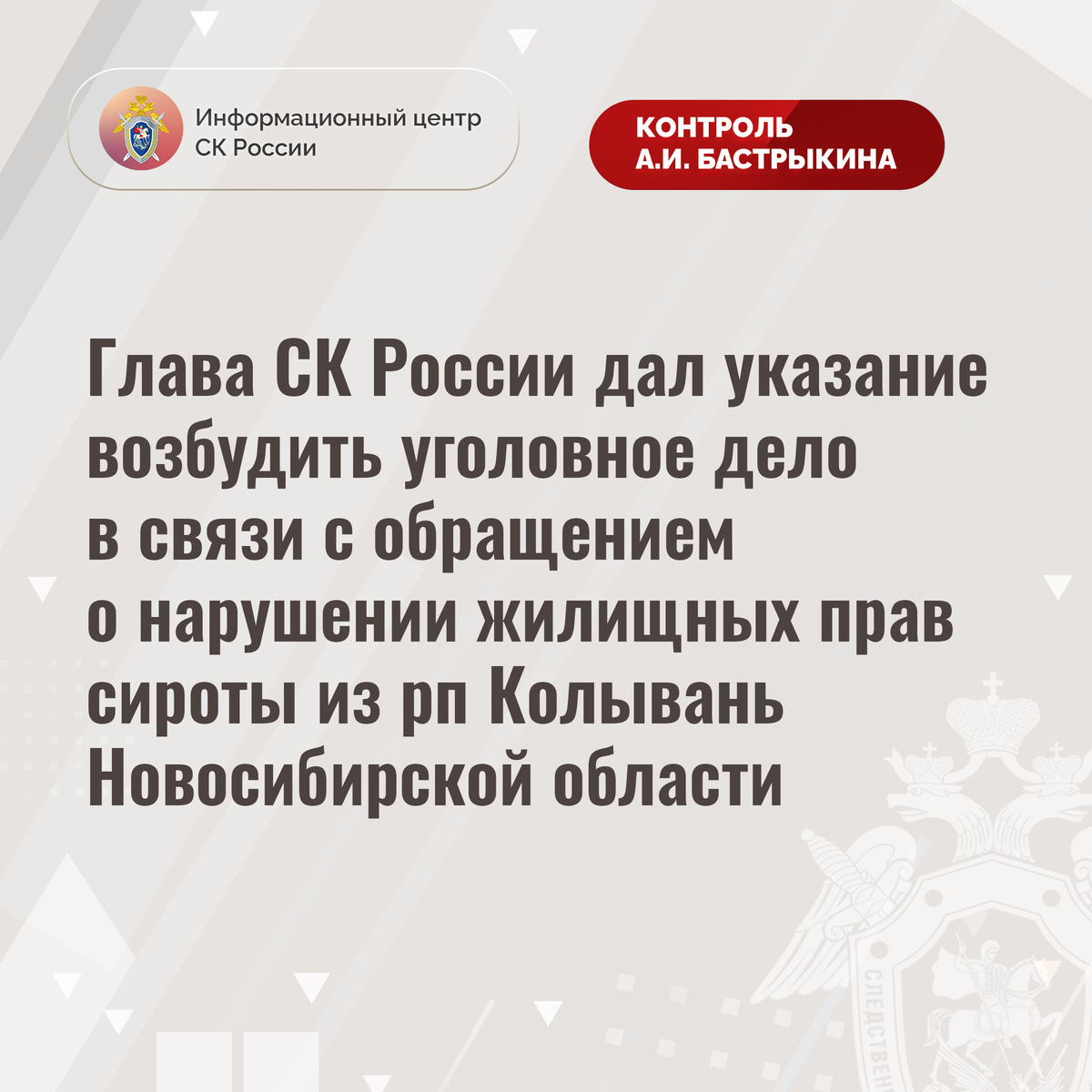 Глава СК России дал указание возбудить уголовное дело в связи с обращением о нарушении жилищных прав сироты из рп Колывань