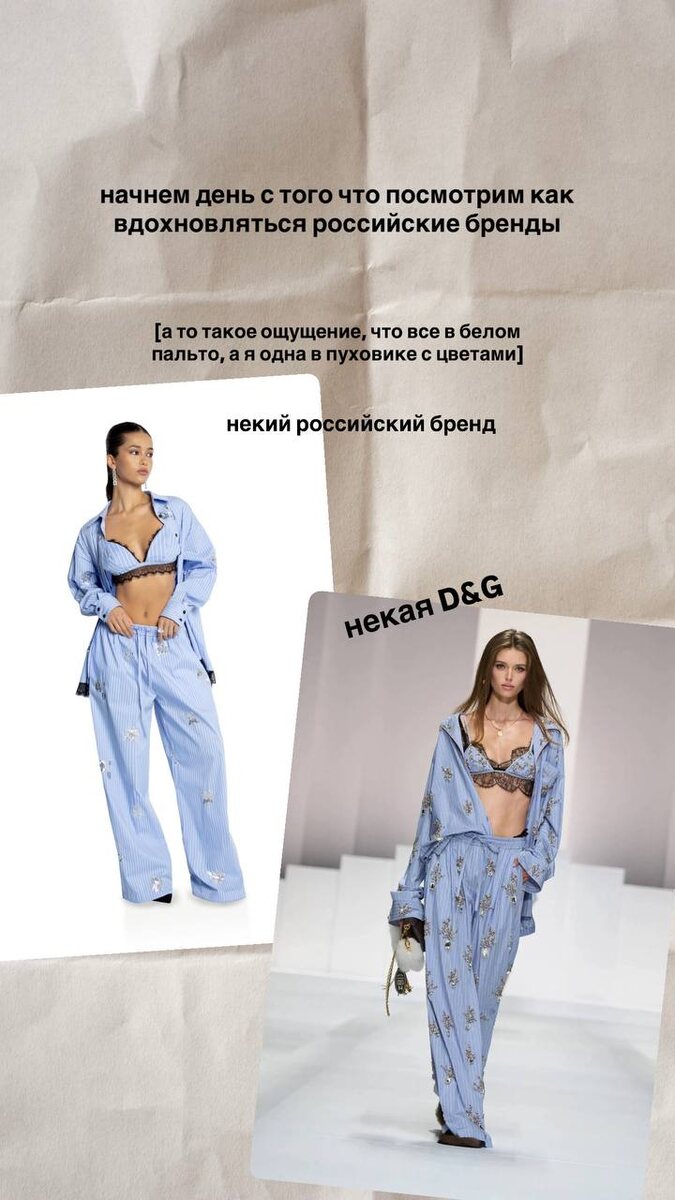 за что, господииии не, не то. ну вот Настя Бруно, снимает ролики на ютуб, повторяет платья то с модных показов, то из фильма Круэлла, делая копии… вот вам сделала коллаж еще, просто удивилась когда увидела у российского бренда так сказать вдохновение с подиума. а комментаторша одна неугомонная пошла искать что я еще шила и откуда брала идеи. половина швейных блогеров шила парку THEROW. 90% показывают фотки с пинтерест, подиумов и сайтов брендов как пример что хотят сшить. ладно, мне прислали пример вчера про броши (Big Brooch или как-то так), которые 4 миллиона требовали с мастеров. да я знаю про свитшот с корсетом, потому что Ксения была у меня на подкасте (можете найти), но везде! везде у них была коммерческая выгода. просто крик души. хочу поговорить с умными людьми и да! я буду делать эпизод с юристом, где мы обсудим все эти тонкости, чтобы больше ни я, ни вы не попадали в такие ситуевины.